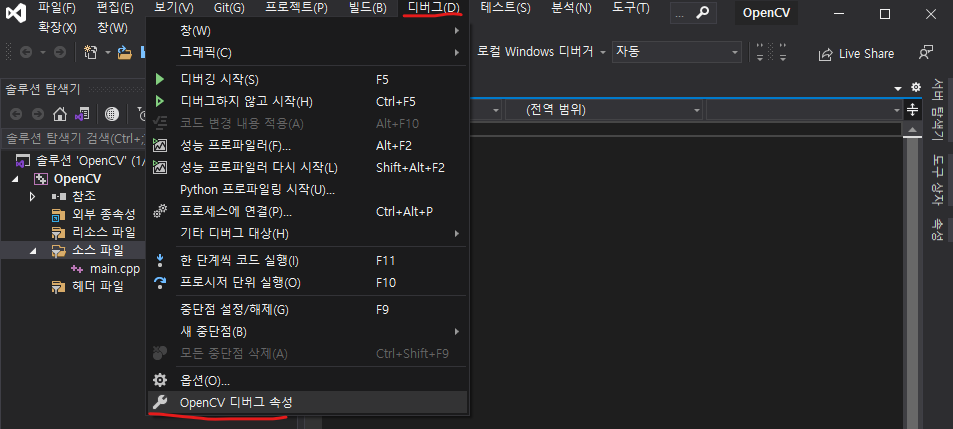 - 디버그- OpenCV(프로젝트 이름) 디버그 속성 클릭