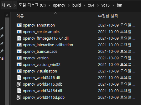 - C:\opencv\build\x64\vc15\bin 위치에서 opencv_world3416d.lib 확인 (버전별로 숫자 다름 )