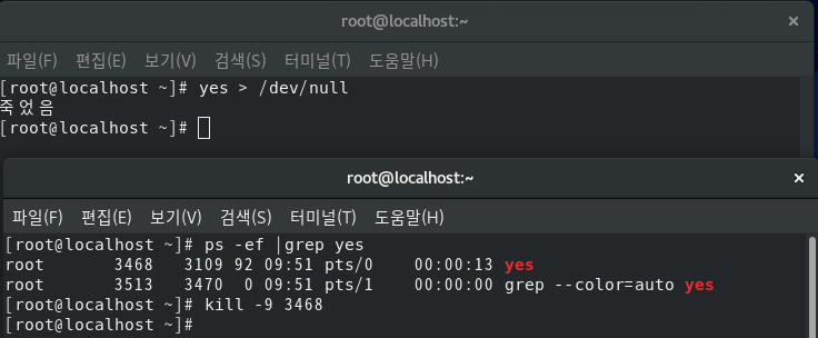 ps -ef | grep yes명령으로 프로세스를 확인함.