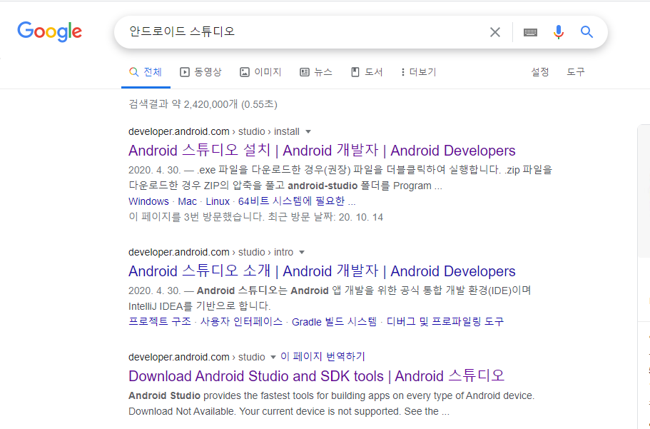 - 구글 검색창에 : 안드로이드 스튜디오 검색