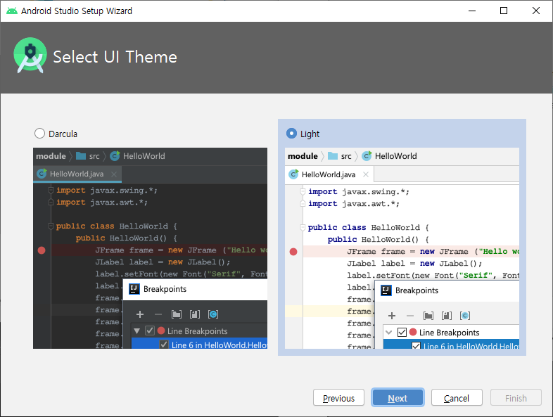 - 실행화면 창을 밝은색 / 어두운 색 선택