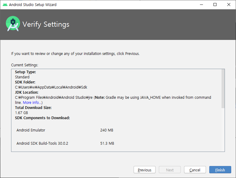 - 설정 확인 -> Finish 누름